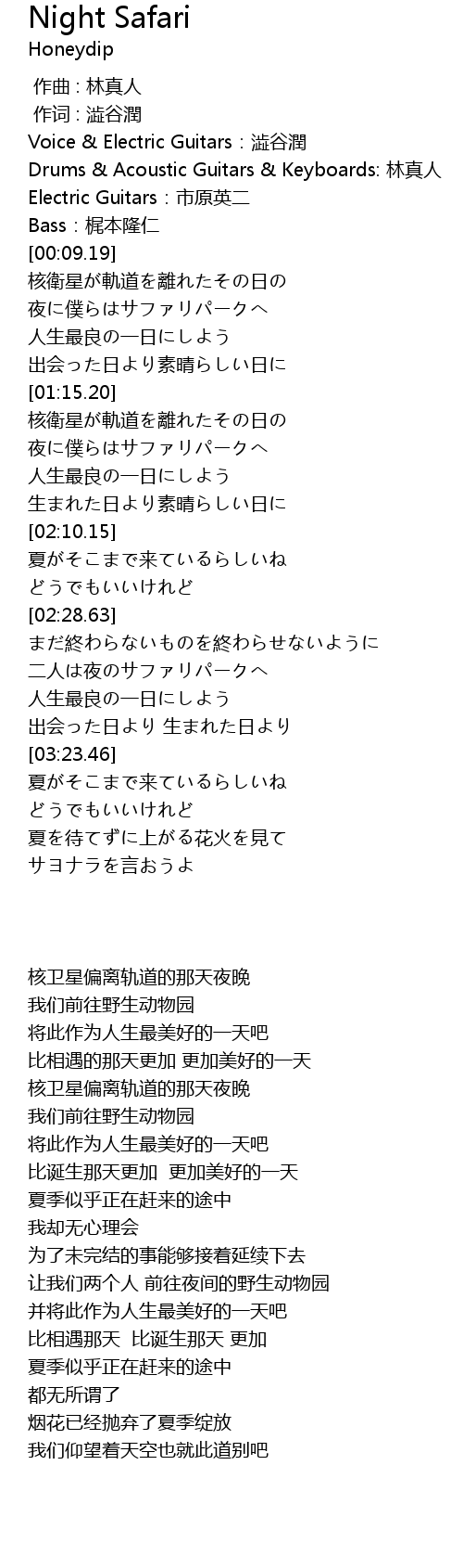 | [01:43.21] | 夜に僕らはサファリパークへ |
