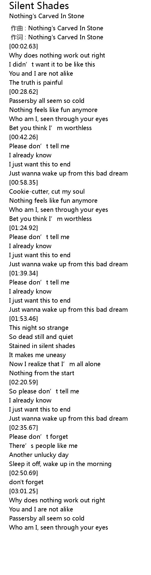 | [00:00.000] | zuò qǔ : Nothing' s Carved In Stone |