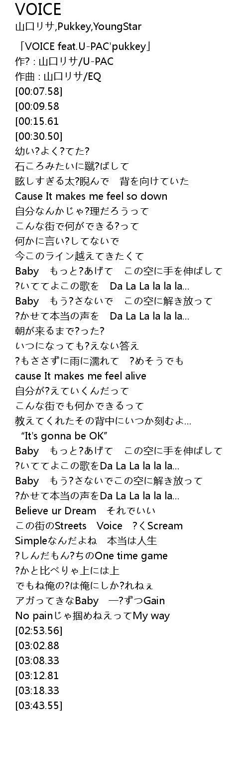 | [00:01.58] | 「VOICE feat.U-PAC'pukkey」 |