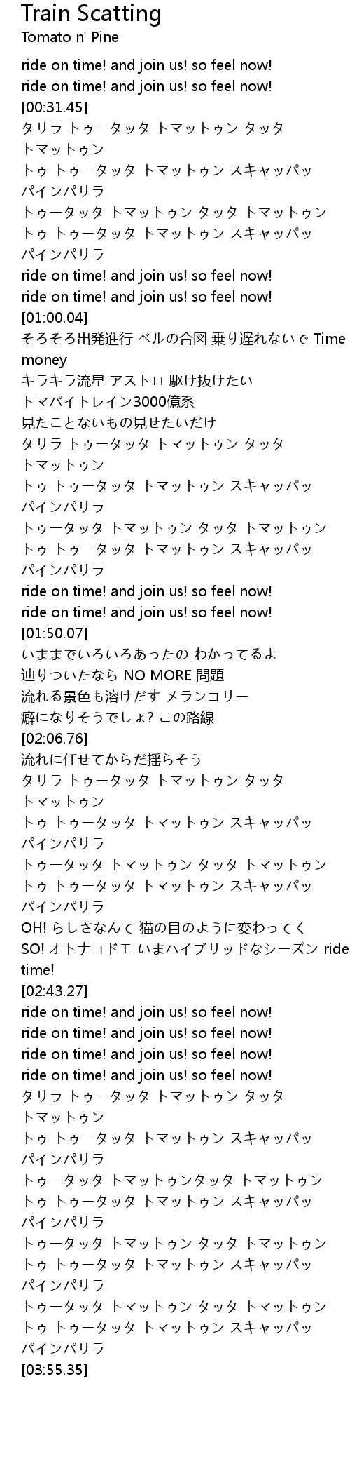 | [03:35.68] | トゥ トゥータッタ トマットゥン スキャッパッ パインパリラ |