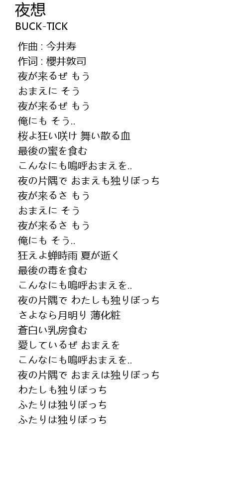 | [00:52.170] | 夜の片隅で おまえも独りぼっち |