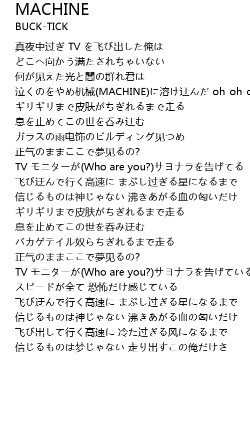 | [00:42.44] | 泣くのをやめ机械(MACHINE)に溶け迂んだ oh-oh-oh |