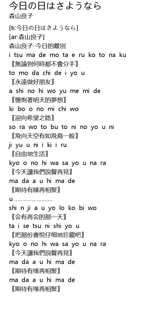 | [01:52.985] | kyo o no hi wa sa yo u na ra |