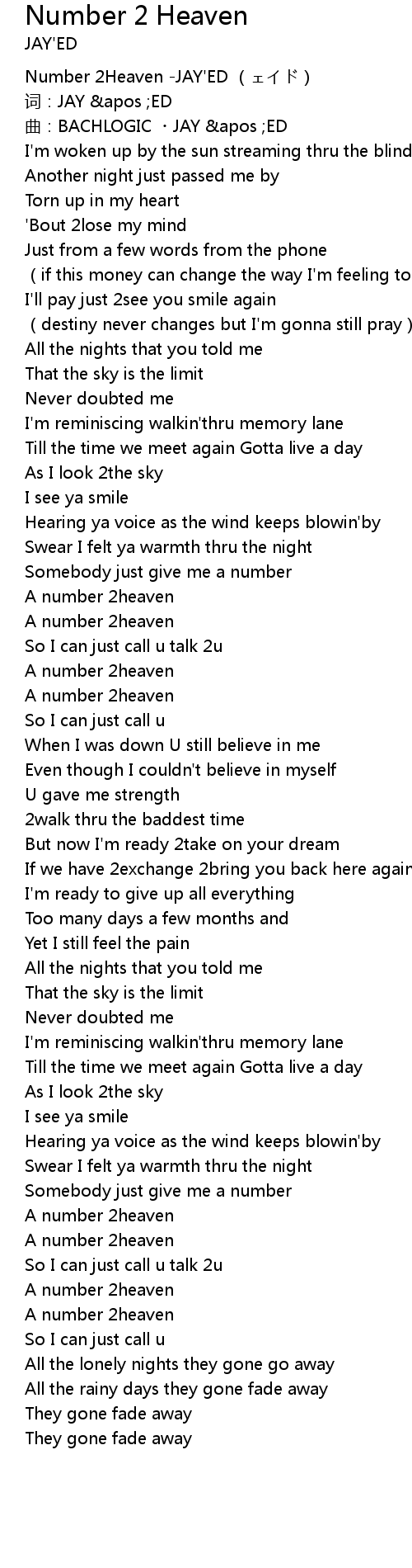 | [00:00.00] | Number 2Heaven JAY' ED |