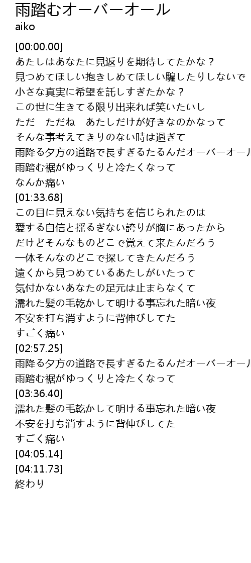 | [03:20.88] | 雨降る夕方の道路で長すぎるたるんだオーバーオール |
