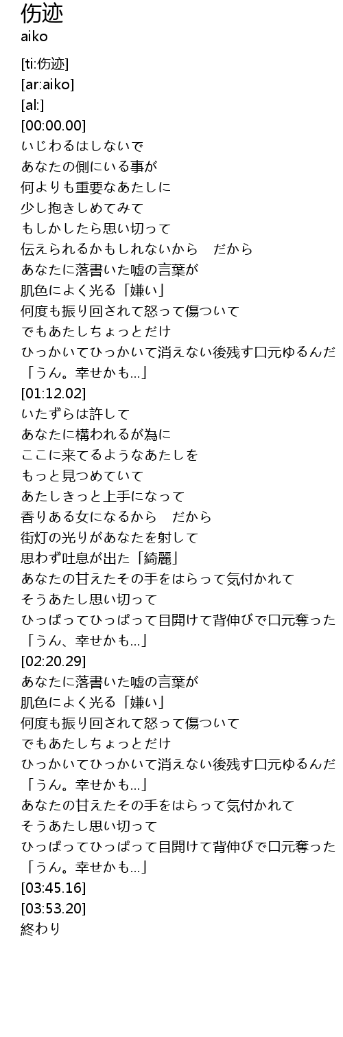 | [03:16.44] | ひっかいてひっかいて消えない後残す口元ゆるんだ |