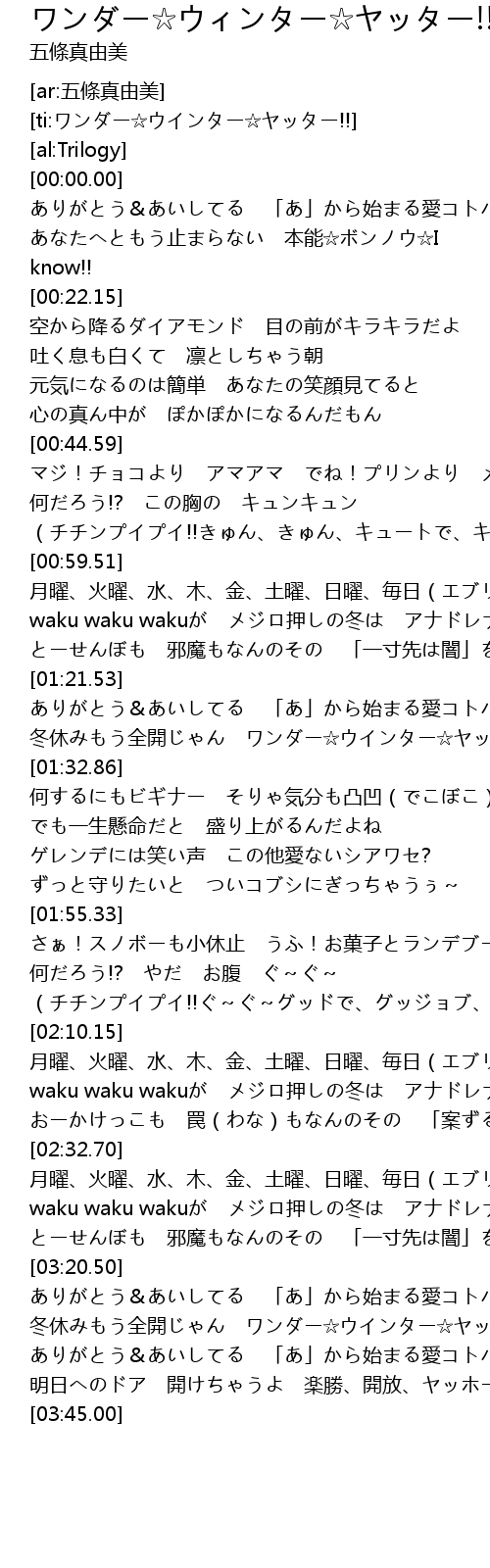 | [03:26.44] | 冬休みもう全開じゃん ワンダー☆ウインター☆ヤッター!! |