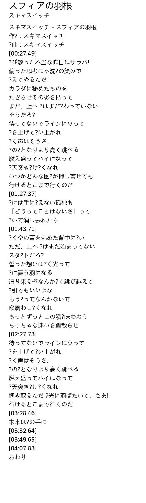 | [00:00.00] | スキマスイッチ - スフィアの羽根 |