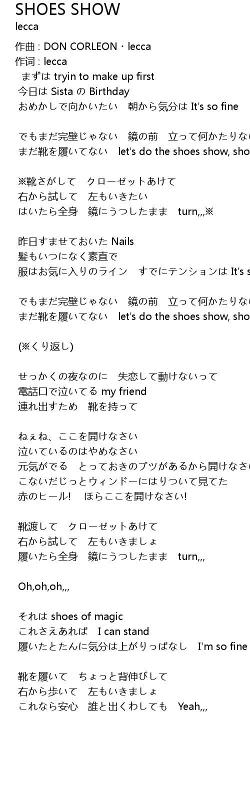 | まだ靴を履いてない let's do the shoes show, shoes show, shoes show | |