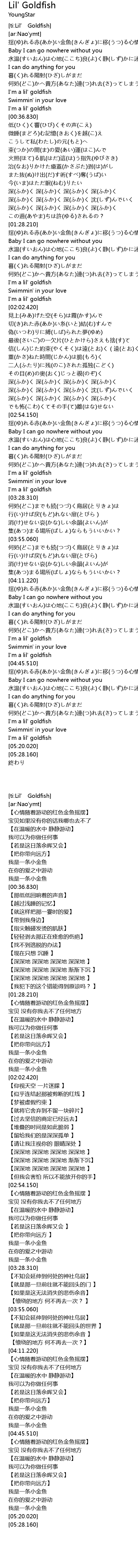 | [04:37.330] | I' m a lil' goldfish |