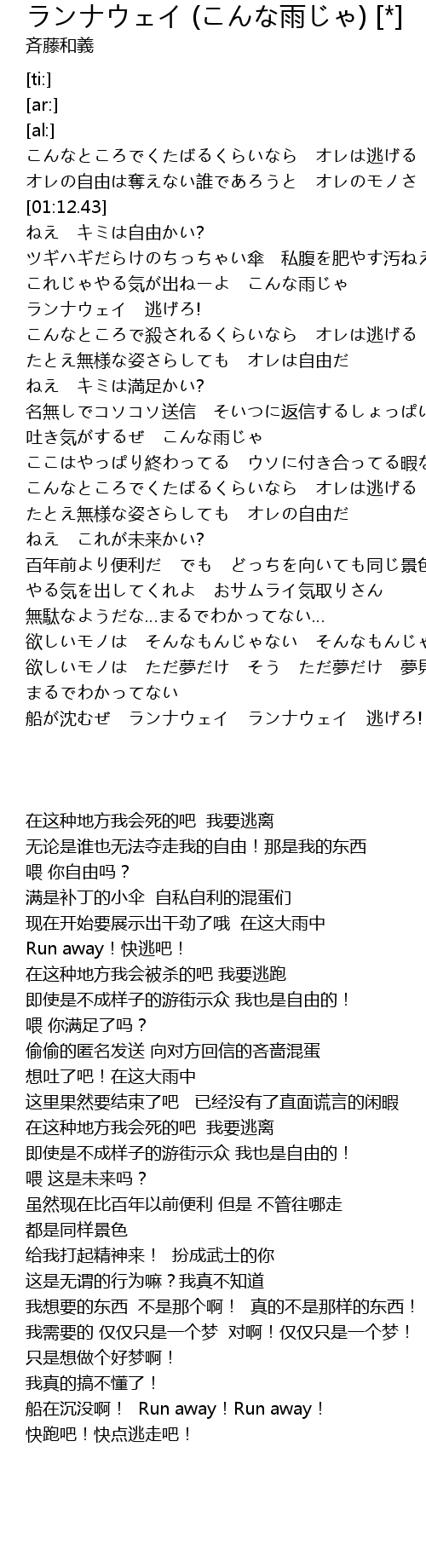 | [04:01.92] | 船が沈むぜ ランナウェイ ランナウェイ 逃げろ! 逃げろ!! |