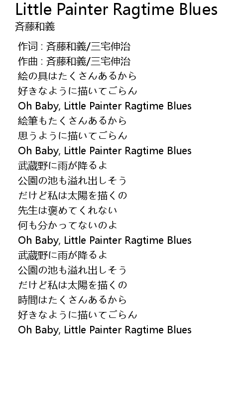 | [02:09.587] | Oh Baby, Little Painter Ragtime Blues |