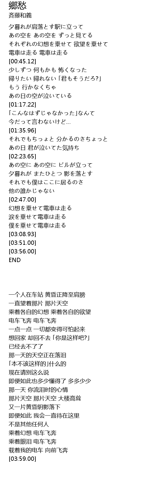 | [00:55.97] | 帰りたい 帰れない 「君もそうだろ?」 |