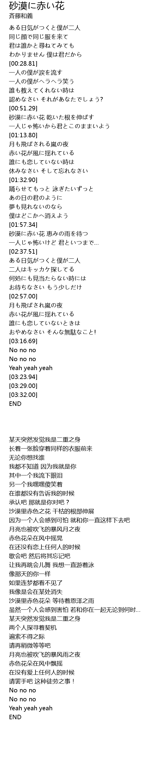 | [02:20.55] | 砂漠に赤い花 恵みの雨を待つ |
