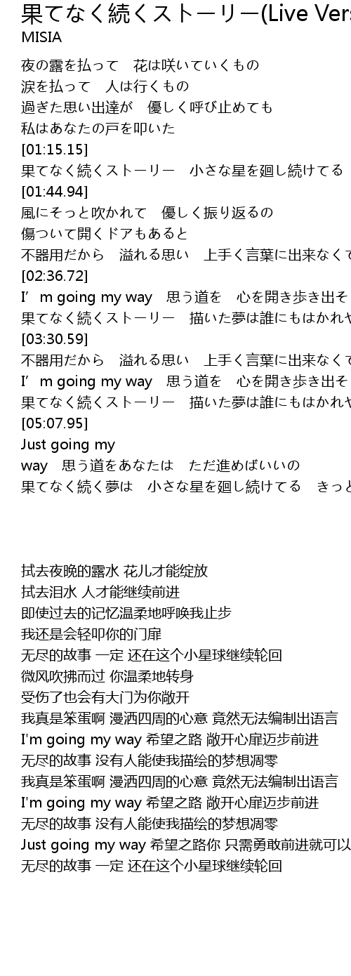 | [01:15.72] | 果てなく続くストーリー 小さな星を廻し続けてる きっと |