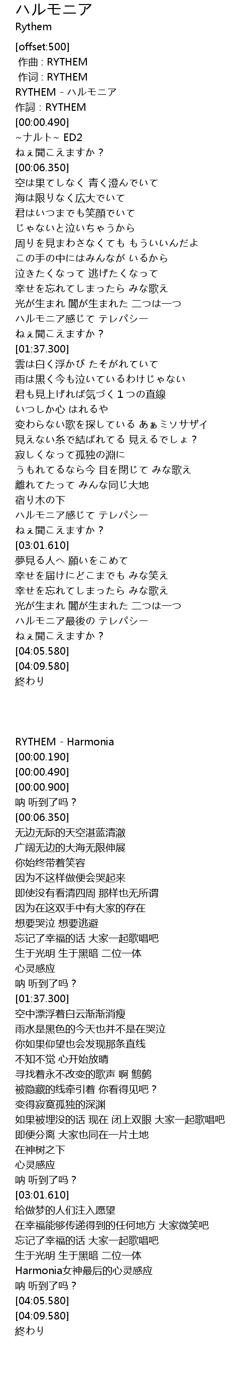 | [00:00.000] | RYTHEM - ハルモニア |