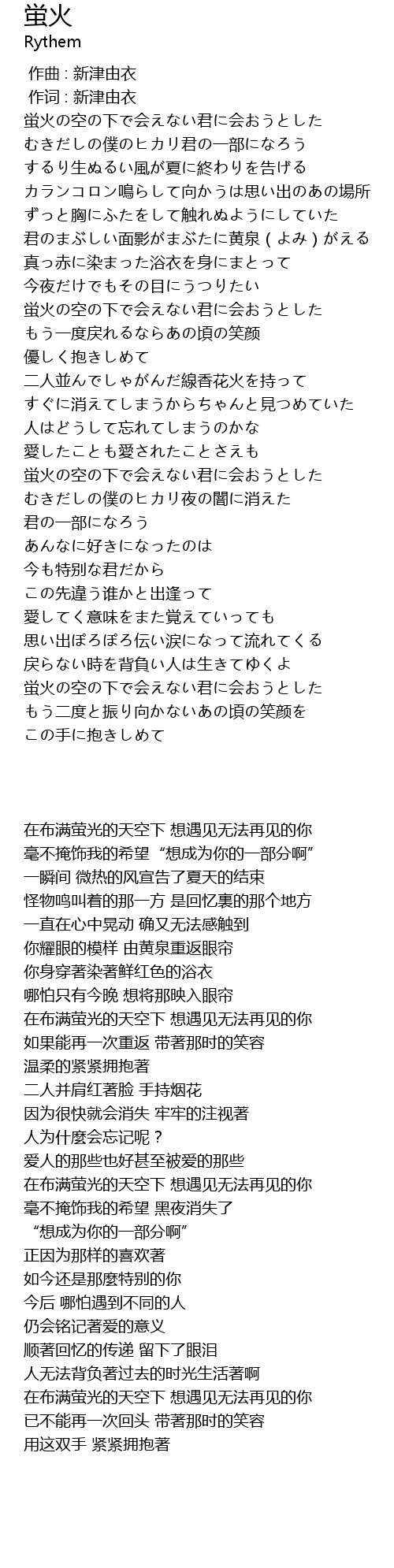| [01:31.70] | 蛍火の空の下で会えない君に会おうとした |
