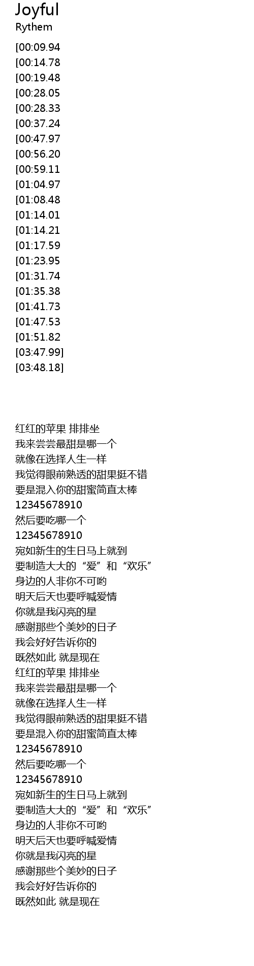 | [03:09.46][01:14.21] | Make big “LOVE” and “JOY”. |