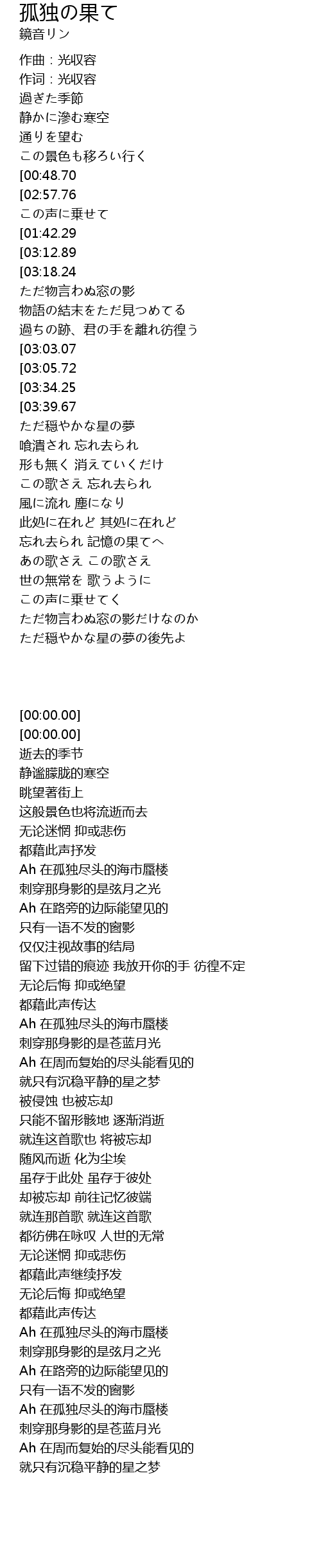 | [00:48.94][01:42.29][03:07.61][03:29.37] | Ah 孤独の果ての蜃気楼 |