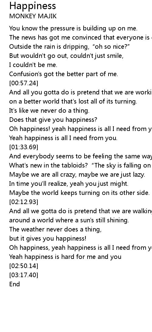 | [01:14.91] | Oh happiness! yeah happiness is all I need from you. |