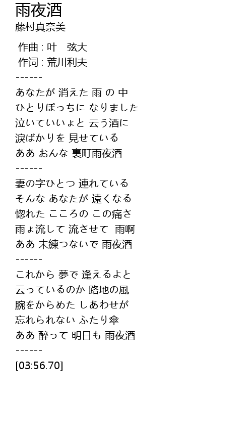 | [03:33.73] | ああ 醉って 明日も 雨夜酒 |