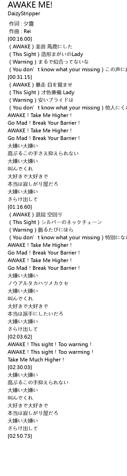 | [01:38.50] | AWAKE! Take Me Higher! |