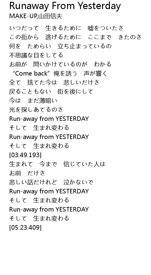 | [02:13.891] | “Come back”俺を誘う 声が響く |
