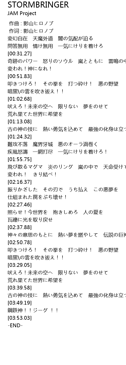 | [00:31.70] | 奇跡のパワー 怒りのソウル 嵐とともに 雷鳴の中 |