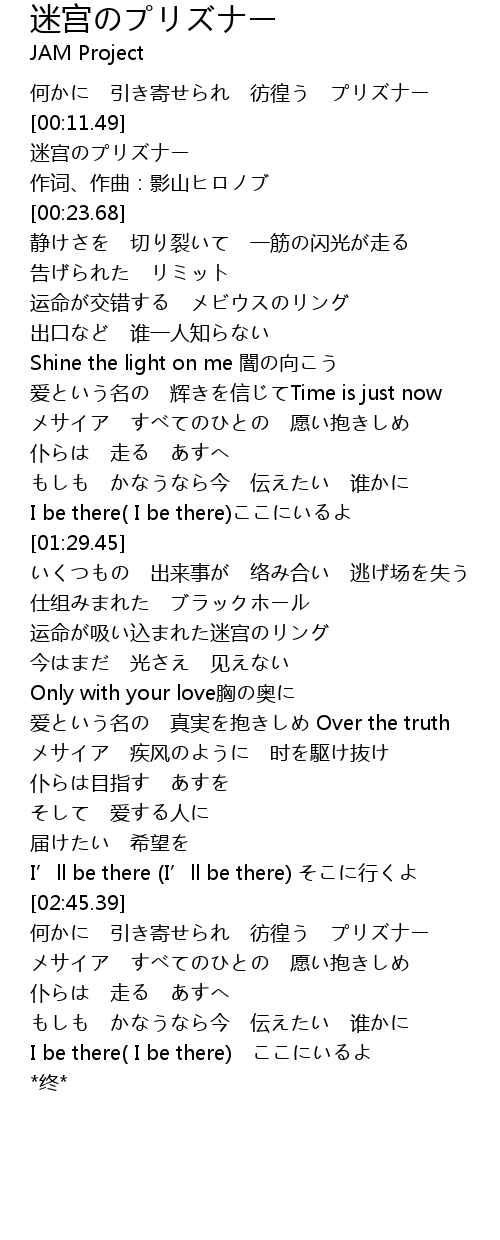 | [03:20.07] | 何かに 引き寄せられ 彷徨う プリズナー |
