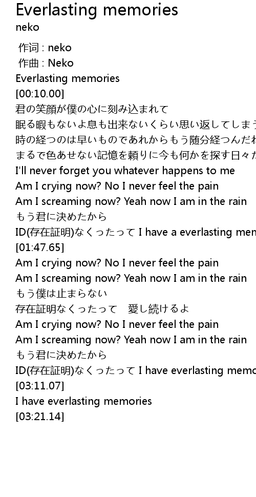 | [03:00.89] | ID(存在証明)なくったって I have everlasting memories |