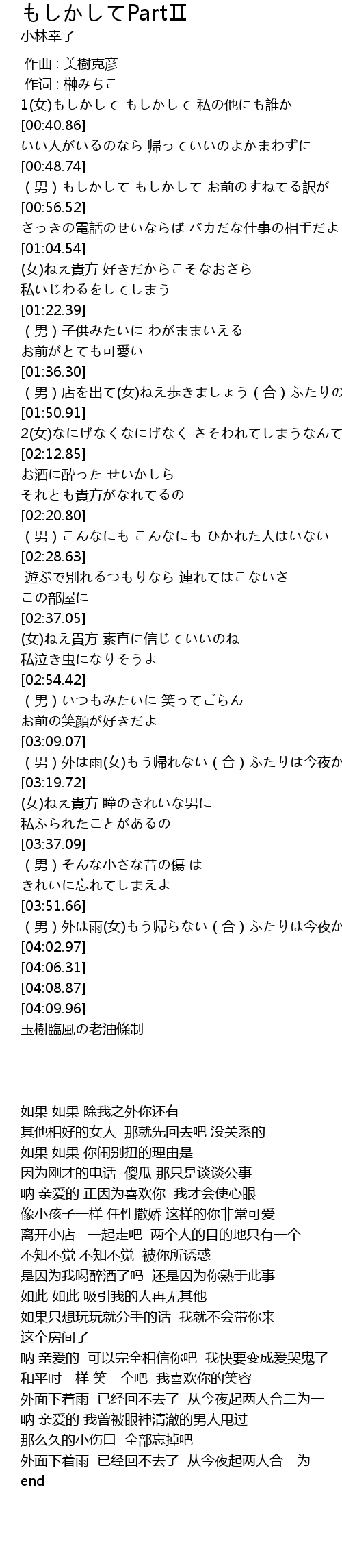 | [03:10.71] | (男)外は雨(女)もう帰れない(合)ふたりは今夜からひとつ |