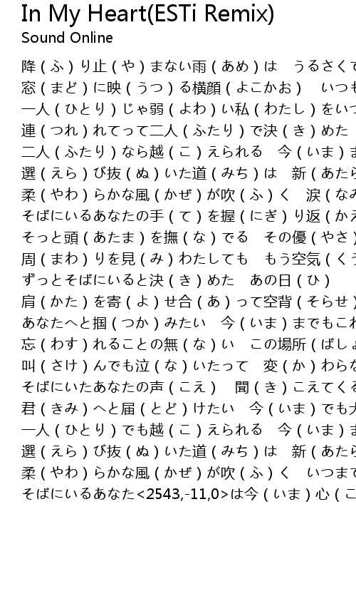 | [03:54.160] | そばにいるあなた<2543,-11,0>は今(いま)心(こころ)の中(なか)に |
