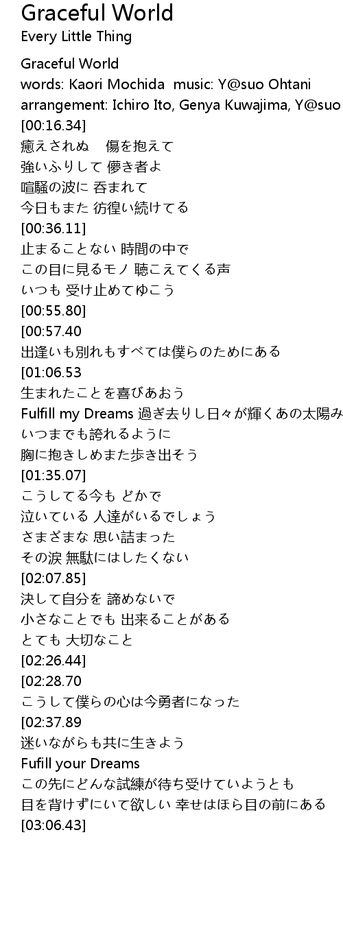 | [03:39.32][00:57.40] | Graceful World 出逢いも別れもすべては僕らのためにある |