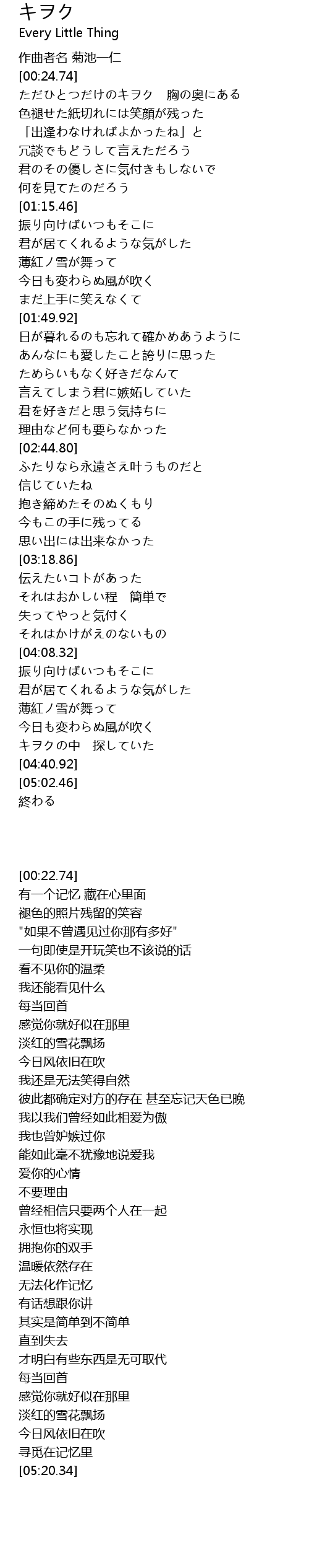 | [00:26.74] | ただひとつだけのキヲク 胸の奥にある |