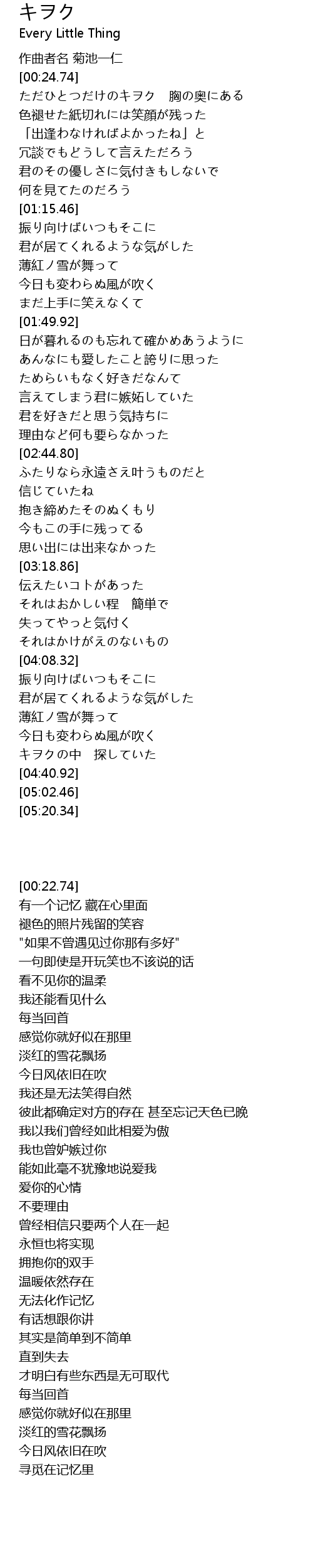 | [04:30.68] | キヲクの中 探していた |