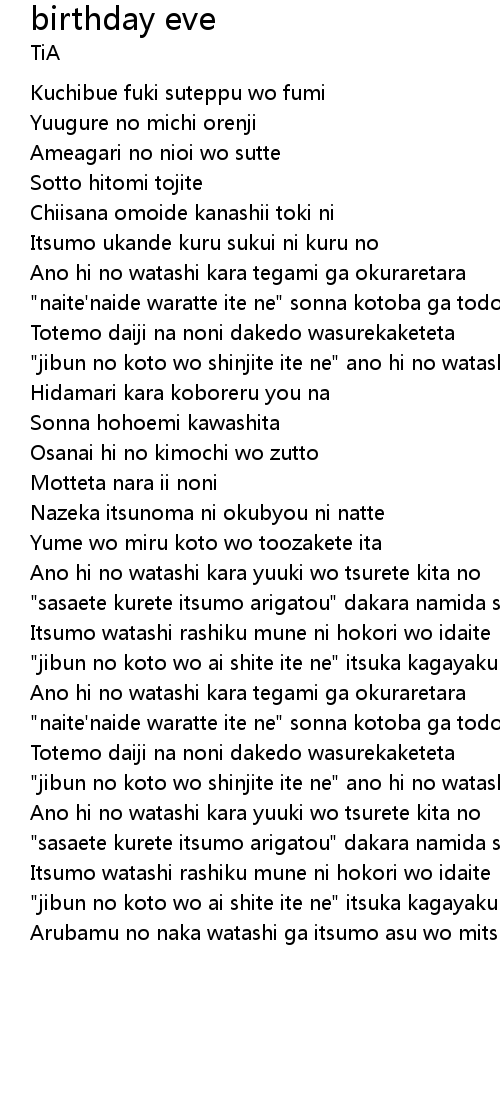 | "jibun no koto wo shinjite ite ne" ano hi no watashi mamoreru you ni | |