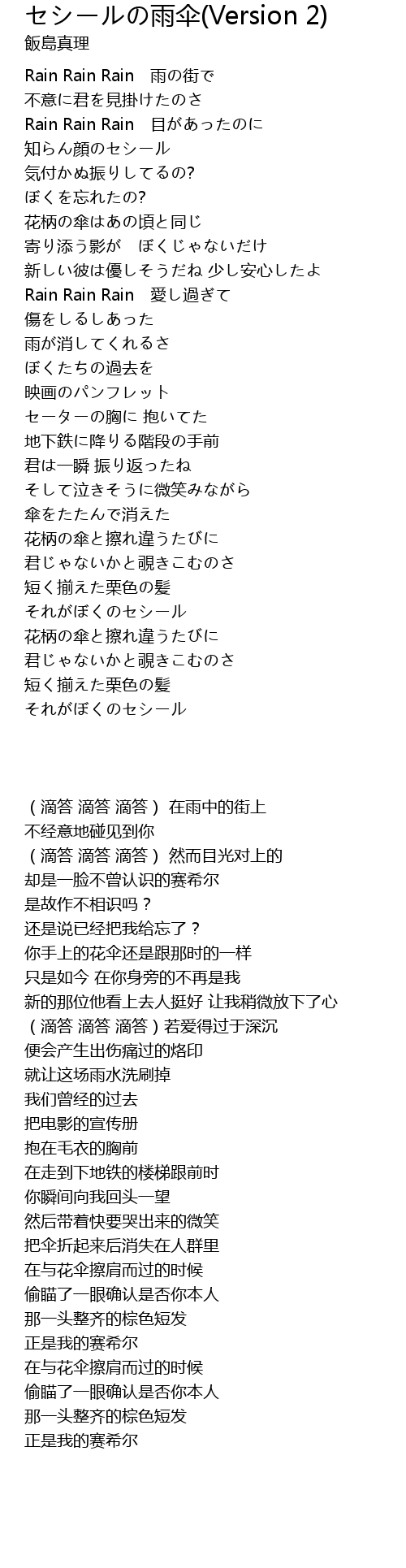 | [00:21:00] | Rain Rain Rain yǔ jiē |