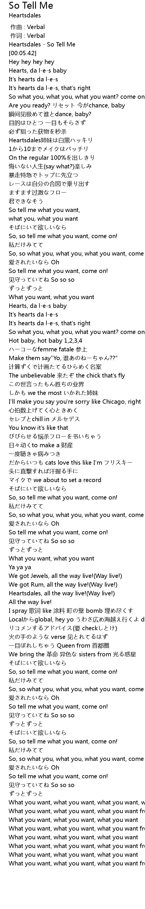 | [02:58.71] | So, so tell me what you want, come on! |