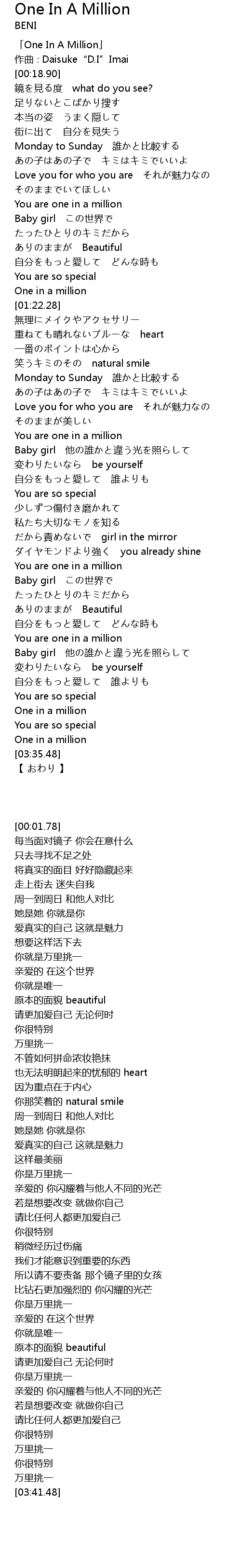 | [02:03.58] | Baby girl 他の誰かと違う光を照らして |