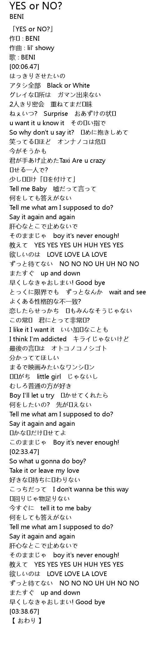| [03:21.35] | 教えて YES YES YES UH HUH YES YES |
