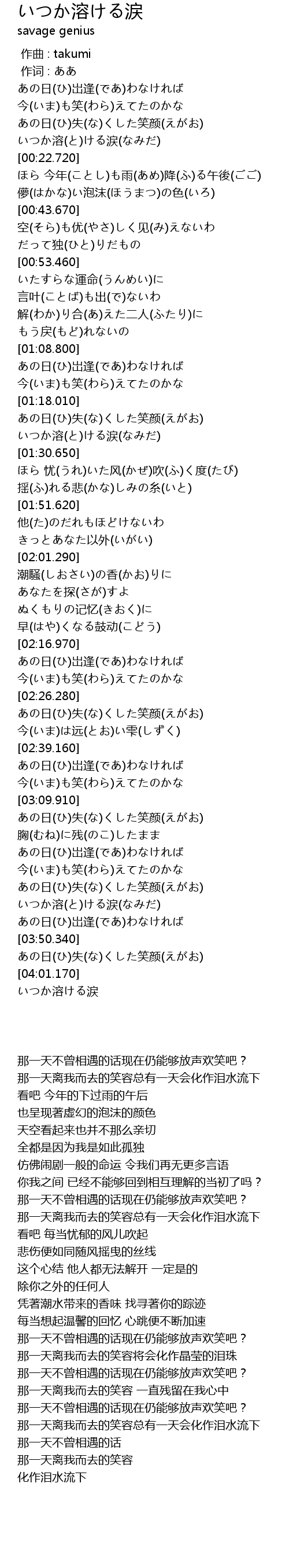 | [03:33.960] | あの日(ひ)失(な)くした笑颜(えがお) いつか溶(と)ける涙(なみだ) |
