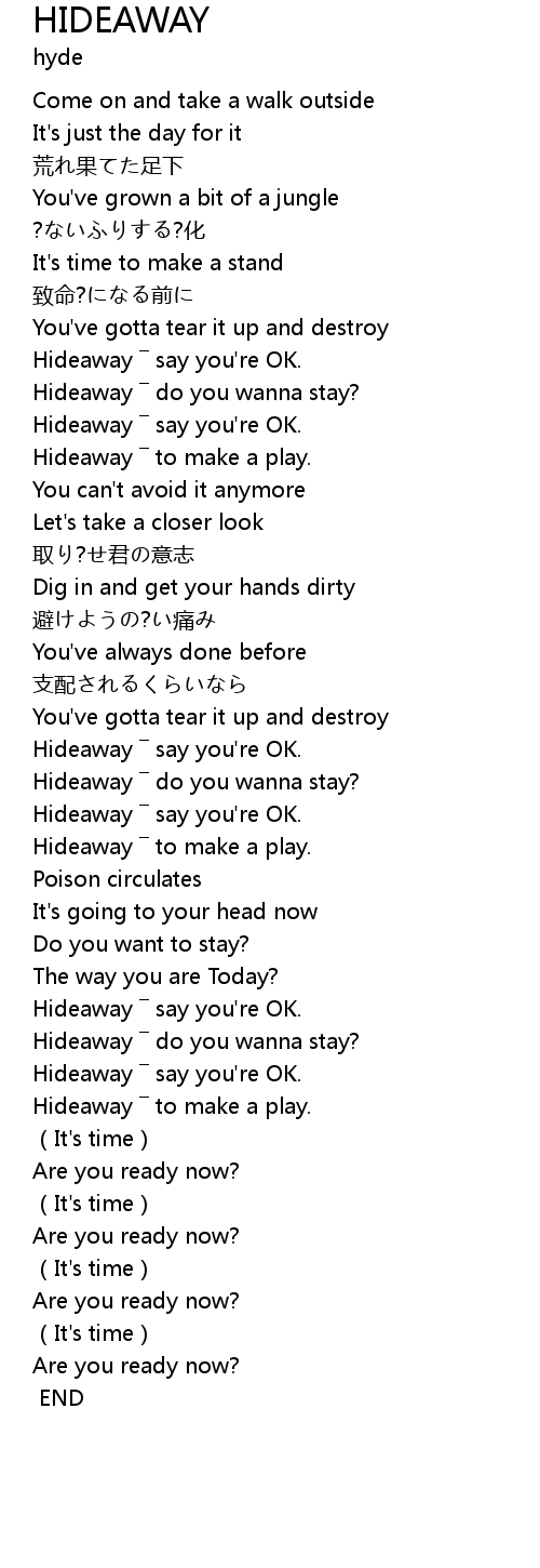 | [02:13.81] | Hideaway ― do you wanna stay? |