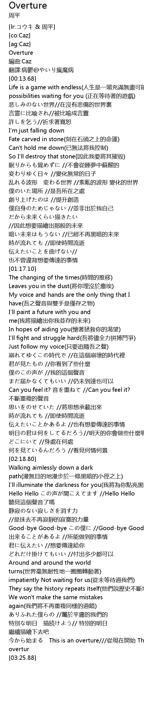 | [03:18.07] | jīn shǐ This is an overture cóng xiàn zài kāi shǐ This is an overtur |