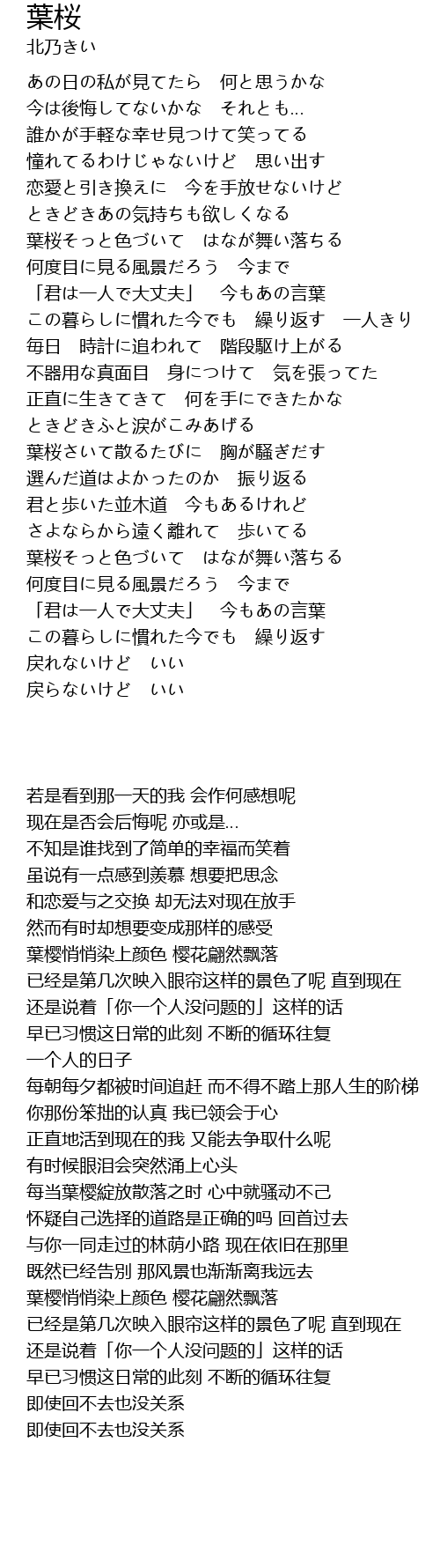 | [01:36.27] | 葉桜そっと色づいて はなが舞い落ちる |