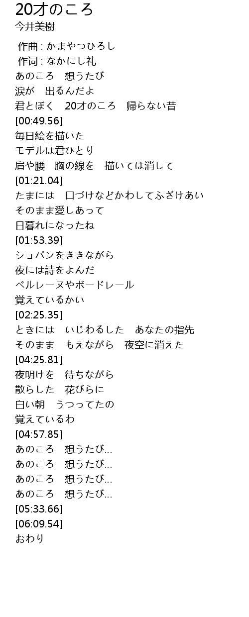 | [00:35.39] | 君とぼく 20才のころ 帰らない昔 |