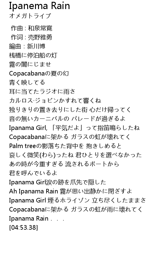 | [03:22.80] | Ah Ipanama Rain 霧が思い出静かに閉ざすよ |