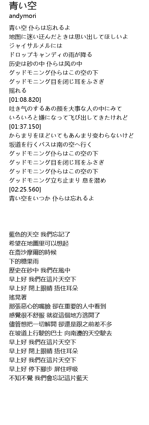 | [02:43.680] | 青い空をいつか 仆らは忘れるよ |