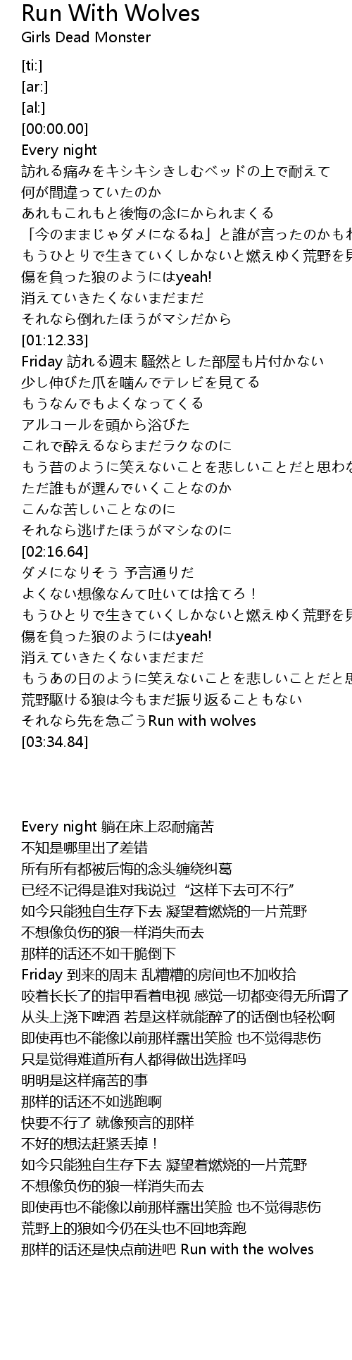 | [00:58.50] | 傷を負った狼のようにはyeah! 消えていきたくないまだまだ |