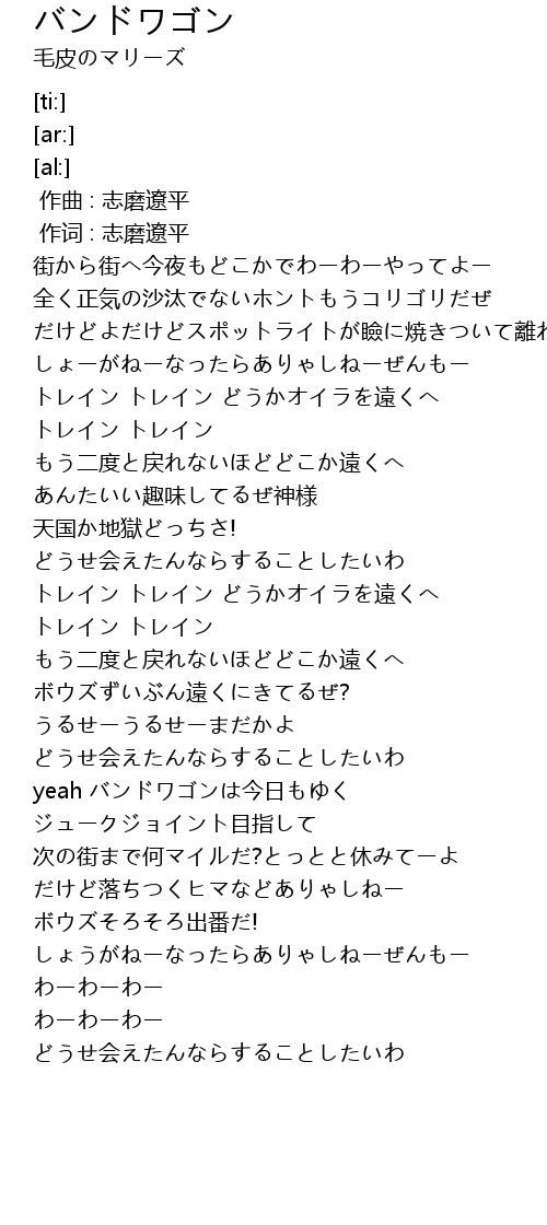 | [01:55.72] | yeah バンドワゴンは今日もゆく ジュークジョイント目指して |