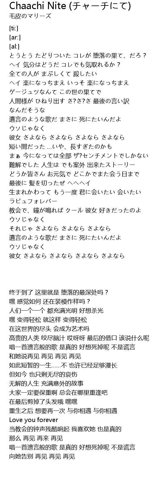 | [03:44.30] | 遺言のような歌だ まさに 死にたいんだよ ウソじゃなく |